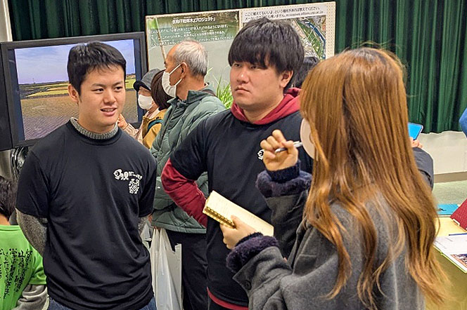 昨年12月、4年の伊藤陸翔(りくと)さん(22)と大学院生の西野駿治さん(22)、OBで兵庫県立大大学院生の伊藤蓮哉さん(24)が同小を訪れました。3人は閉校イベントで「朝見の条里水田を未来につなぐ」と題して、田んぼの生き物や治水機能などを解説しました。「この地域で研究をさせてもらった恩返しをしたい。地域のすばらしさを知ってもらいたい」との思いを込め、大雨が降った際、浸水区域がどのように広がるか、田んぼの水路がどのような役割を果たすかなどについて、映像を交えて伝えました。