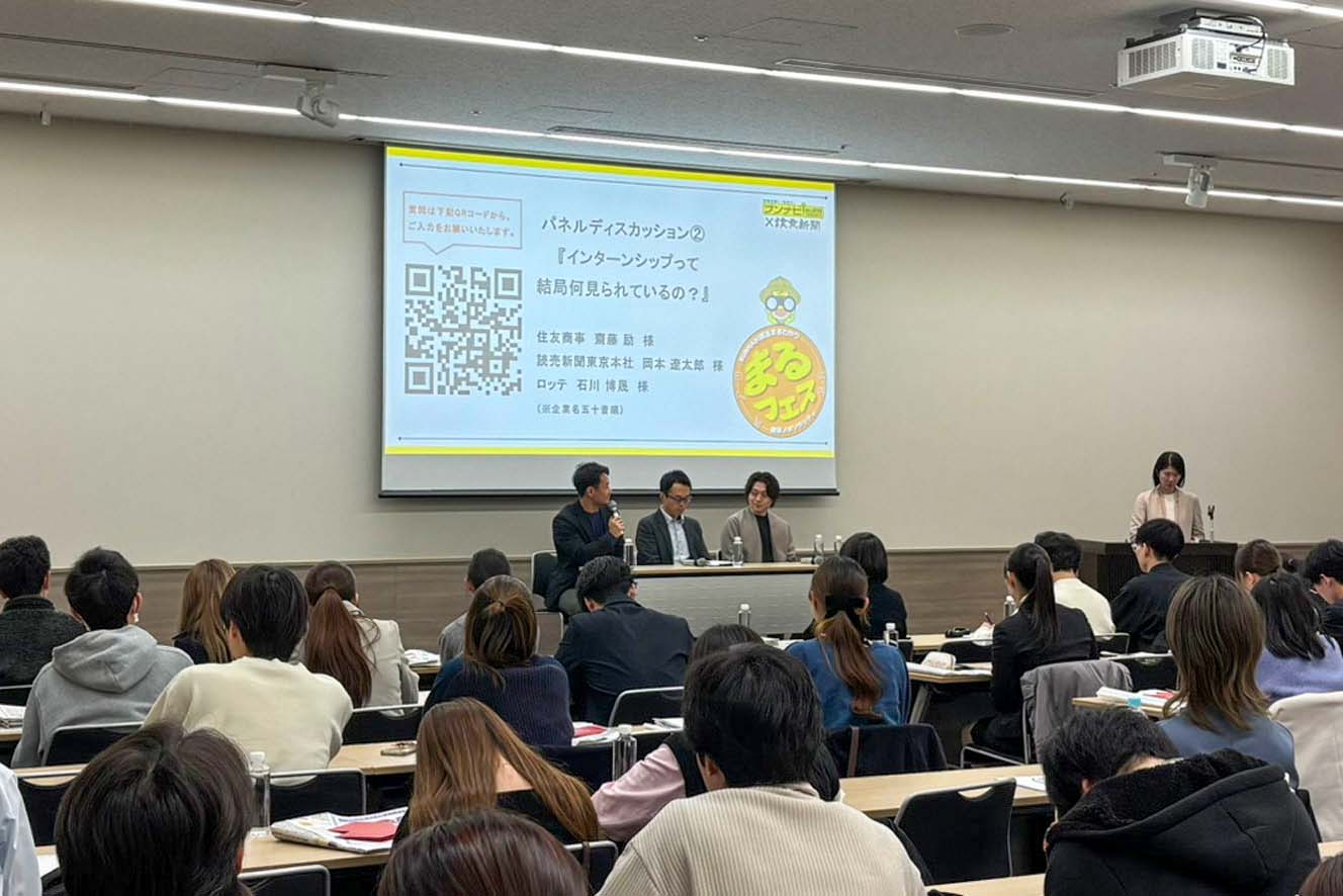 後半は、住友商事、読売新聞東京本社、ロッテから採用担当者の方々が登壇し、これから迎える春や夏のインターンに向けて、企業は学生のどのような点を見ているか、という気になるポイントを教えてくれました。「なぜこの企業を選んだのかという点は本選考で見ます。インターンでは、なぜこの『職種』に興味を持っているのかという、業界への理解度を見ています」とのことでした。