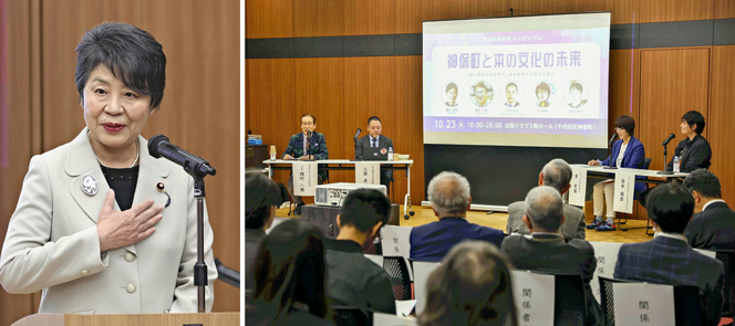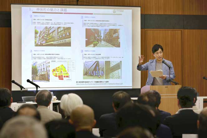 冒頭、活字文化議員連盟の会長を務める上川陽子・元外相が「官民連携で神保町の未来の実現に向けて持てる力を最大限発揮していただきたい」とあいさつ。基調講演では樋口高顕・千代田区長が、魅力ある街並みを維持しつつ、老朽化した建物の建て替えを進めるルール作りの必要性などを語った。