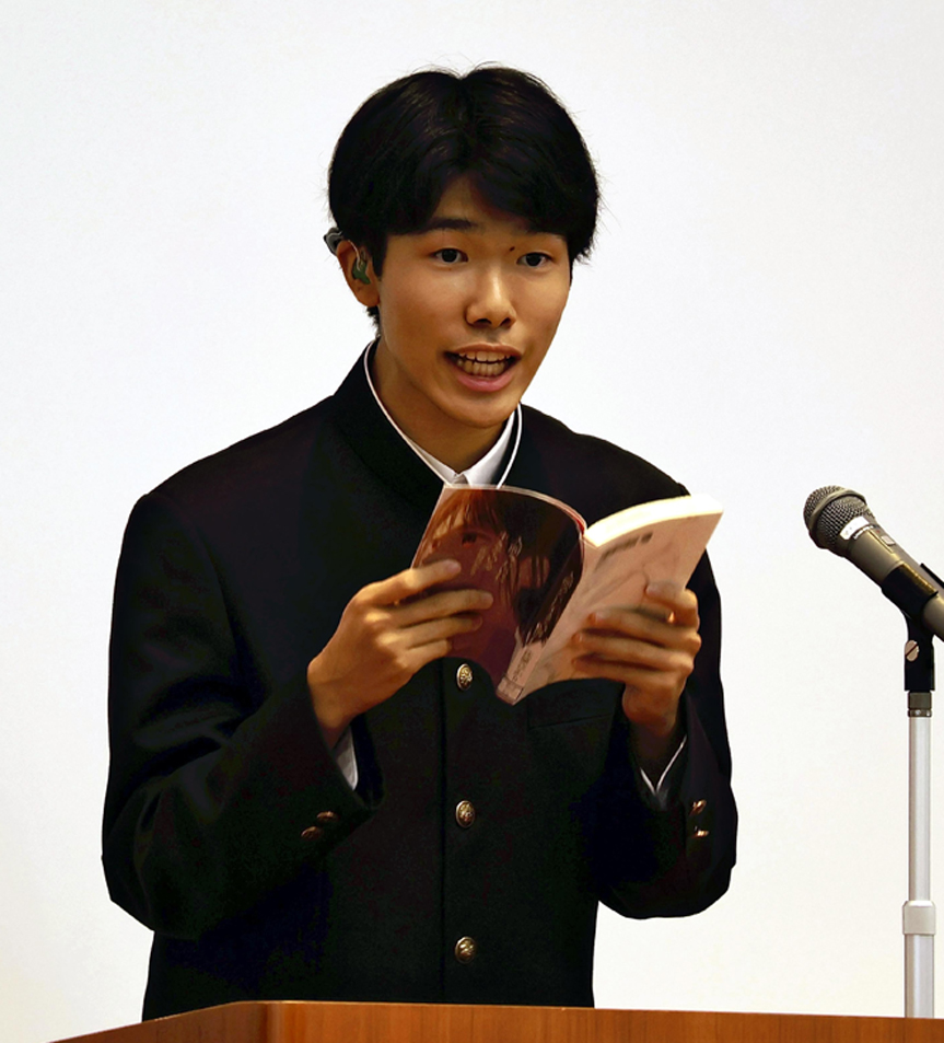聴衆による投票の結果、「人間みたいに生きている」(佐原ひかり著)を取り上げた筑波大付属聴覚特別支援学校高等部普通科2年、関武瑠さん(16)が優勝した。関さんは決勝で食べることが好きな自身と主人公を対比しつつ、「当たり前とは何か」を手話を交えて問いかけた。優勝後、「内容が重たいので読みたいと思ってくれるか不安だったが、自分のおすすめしたい気持ちが伝わった」と笑顔で話した。