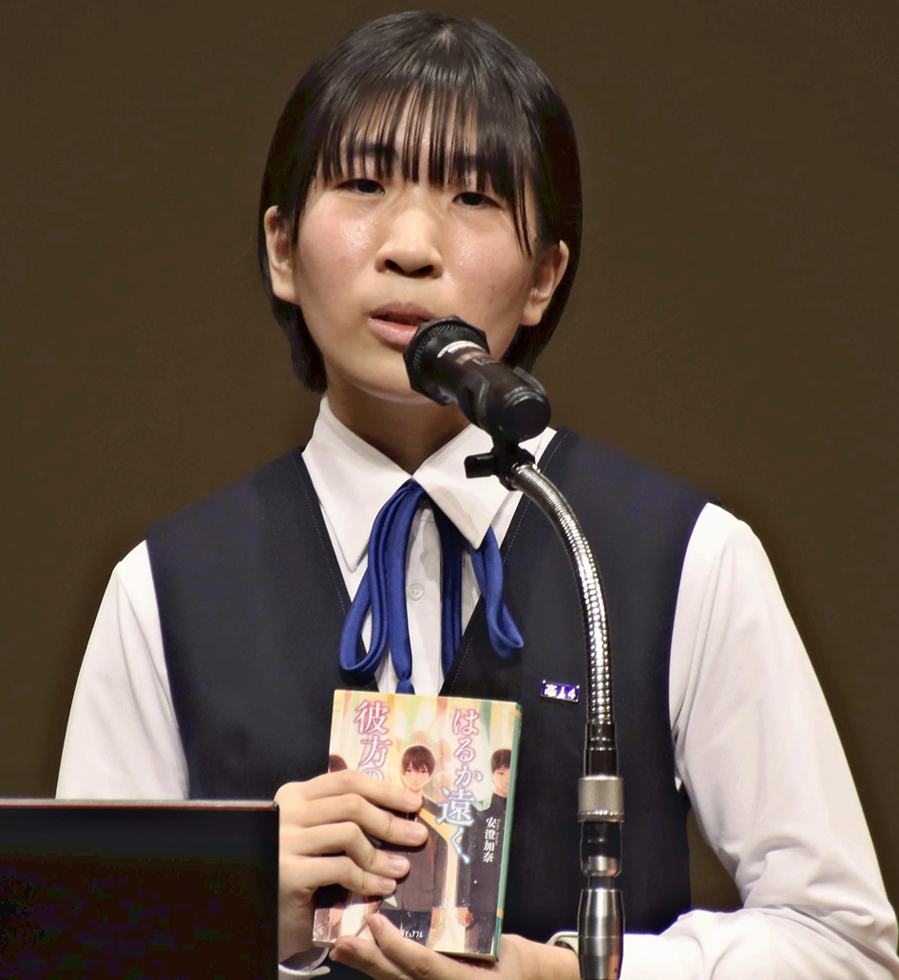 熊本県内から6人が参加。1人5分で約100人を前に発表した。堀尾さんは戦後80年の今年、平和や命について考える人を念頭に、京都への修学旅行で源平合戦にタイムスリップした高校生3人を描いた小説の魅力を語った。「生きること、信じること、誰かを思うこと、今を生きる私たちに大切なことを教えてくれる一冊です」と熱弁した。