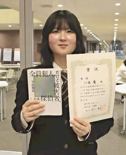川島さんは冒頭、「皆さん、ミステリーはお好きですか」と語りかけ、殺人事件の真相に迫る本の内容に聴衆の興味を引きつけた。昨年の全国大会で惜しくも敗れた川島さんは、「タイトルに心を奪われ、『これしかない』と思って臨んだ。自分らしさ全開で頑張りたい」と意気込みを語った。