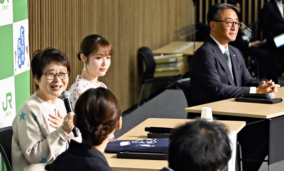 本の魅力を語り合う宮部みゆきさん(左端)、豊嶋花さん(奥左から2人目)、喜勢陽一社長(右端)