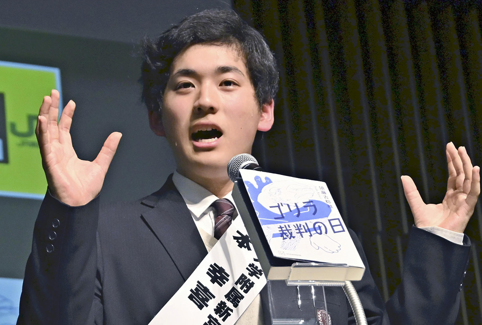 和歌山県代表の近畿大学付属新宮高校1年、榎本幸喜さん(16)は法廷ミステリー「ゴリラ裁判の日」(須藤古都離著、講談社)を紹介した。知能が高くて人間と言葉で会話できる雌ゴリラが、夫を銃殺した動物園を訴えるストーリー。冒頭で人間の夫婦に起きた事件と仮定して「妻の怒りへ共感できる、そう思いませんか」と約700人の観客に問いかけた。