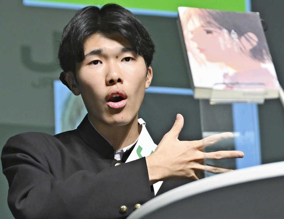 千葉県代表の筑波大学付属聴覚特別支援学校2年・関武瑠さん(17)は小説「人間みたいに生きている」(佐原ひかり著、朝日新聞出版)を取り上げた。食べることを苦しみと感じる女子高校生が主人公の物語だ。「大好きなチョコミントアイスを食べると疲れが吹き飛ぶ私とは真逆の感性。自分が楽しいと思うことが、ほかの誰かにとっては苦しみや重荷になっているかもしれないと、読み進むうちに気付かされた」。決勝では700人の観客を前に、手話をしながら発表した。