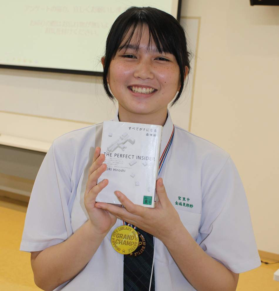 沖縄県中学校ビブリオバトル2025(県学校図書館協議会主催、沖縄市教育委員会共催、県教育委員会など後援)が10月1日、沖縄市立図書館で開かれ、沖縄市立宮里中3年、金城果那紗(きんじょう・かなさ)さん(15)が取り上げたミステリー小説「すべてがFになる」(森博嗣著、講談社)がチャンプ本に輝いた。金城さんは、来年3月に予定されている第9回全国中学ビブリオバトルの出場権を獲得した。