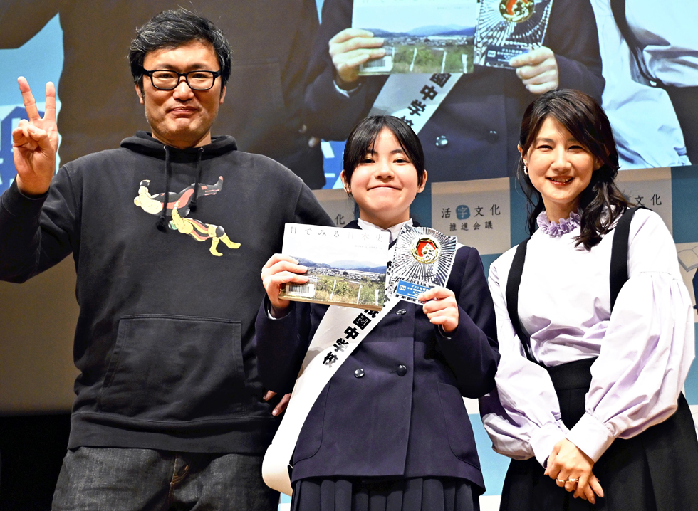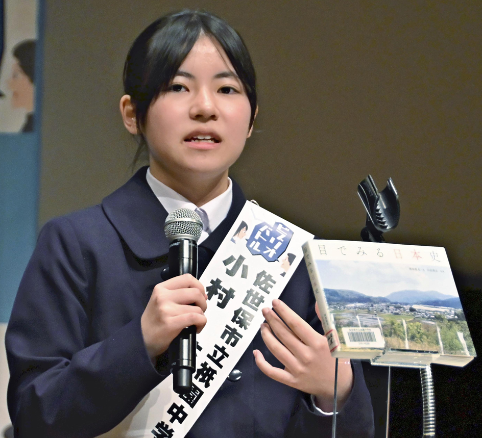 東京都千代田区のよみうり大手町ホールで3月22日に開かれた「第9回全国中学ビブリオバトル」(活字文化推進会議主催、読売新聞社主管)で、長崎県代表の佐世保市立祇園中2年、小村花さん(14)が紹介した写真集「目でみる日本史」(文・岡部敬史、写真・山出高士、東京書籍)がゲスト特別賞に輝いた。