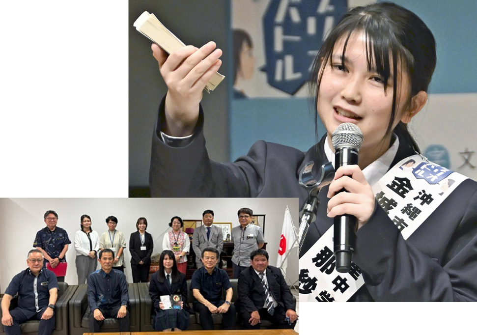 金城さんは優勝報告で、全国大会でのプレゼンテーションを金城弘昌・県教育長らの前で再現した。懇談では「この本を読みたいと思う人が増えたことがうれしい。これからもビブリオバトルを続けていきたいと思います」と笑顔を見せた。