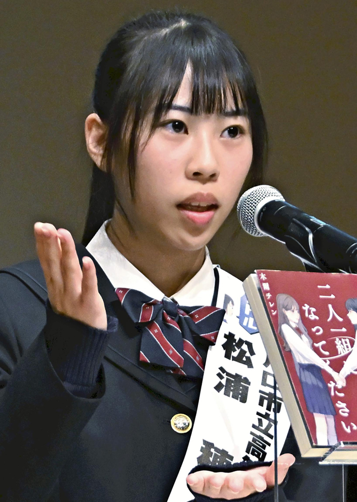 埼玉県代表の川口市立高校付属中3年、松浦穂乙香(ほとか)さんは「二人一組になってください」(木爾チレン著、双葉社)を紹介した。女子高で卒業式直前に始まったデスゲームから、人間関係やいじめがあぶりだされていく小説だ。