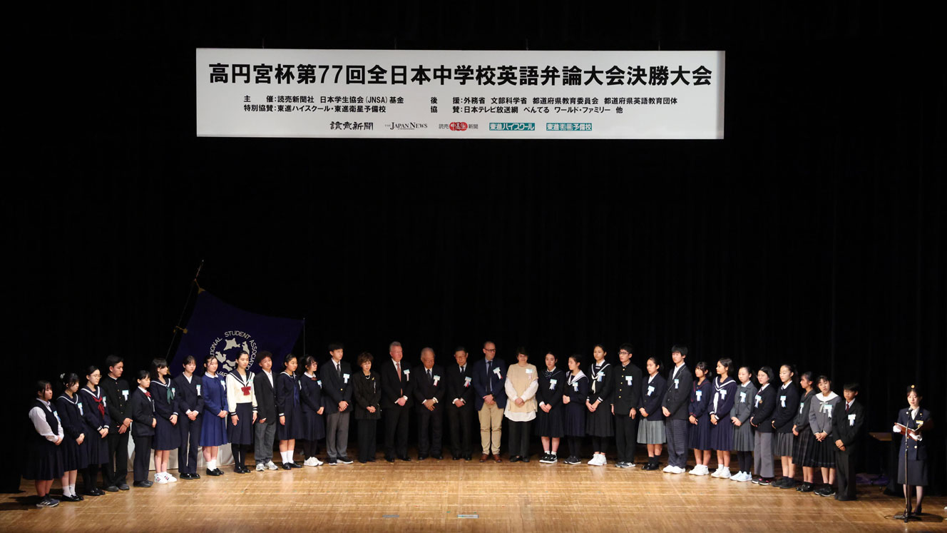 高円宮杯第77回全日本中学校英語弁論大会の決勝大会が2025年11月28日、東京都千代田区の有楽町よみうりホールで開かれ、各賞が決まりました。上位入賞者は以下の方々です。クリックでスピーチ全文をご覧いただけます。